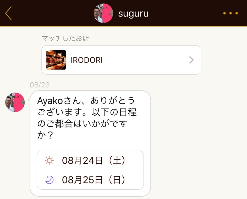 このように、マッチングしたら男性のほうから日程調整の連絡が来ます。