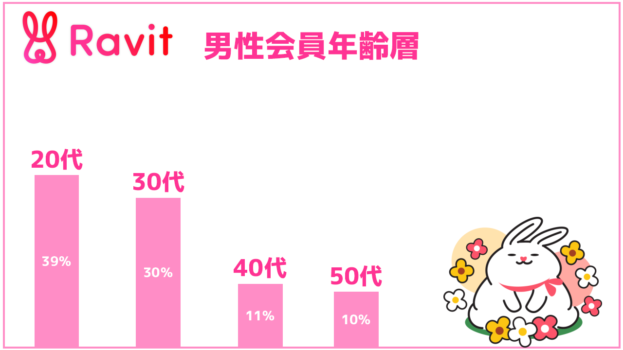 男性会員で最も多かったのは20代でしたが、30代以降も多くいますし、どの年齢層を狙うにしてもRavit(ラビット)を利用する価値は十分にありますよ◎
