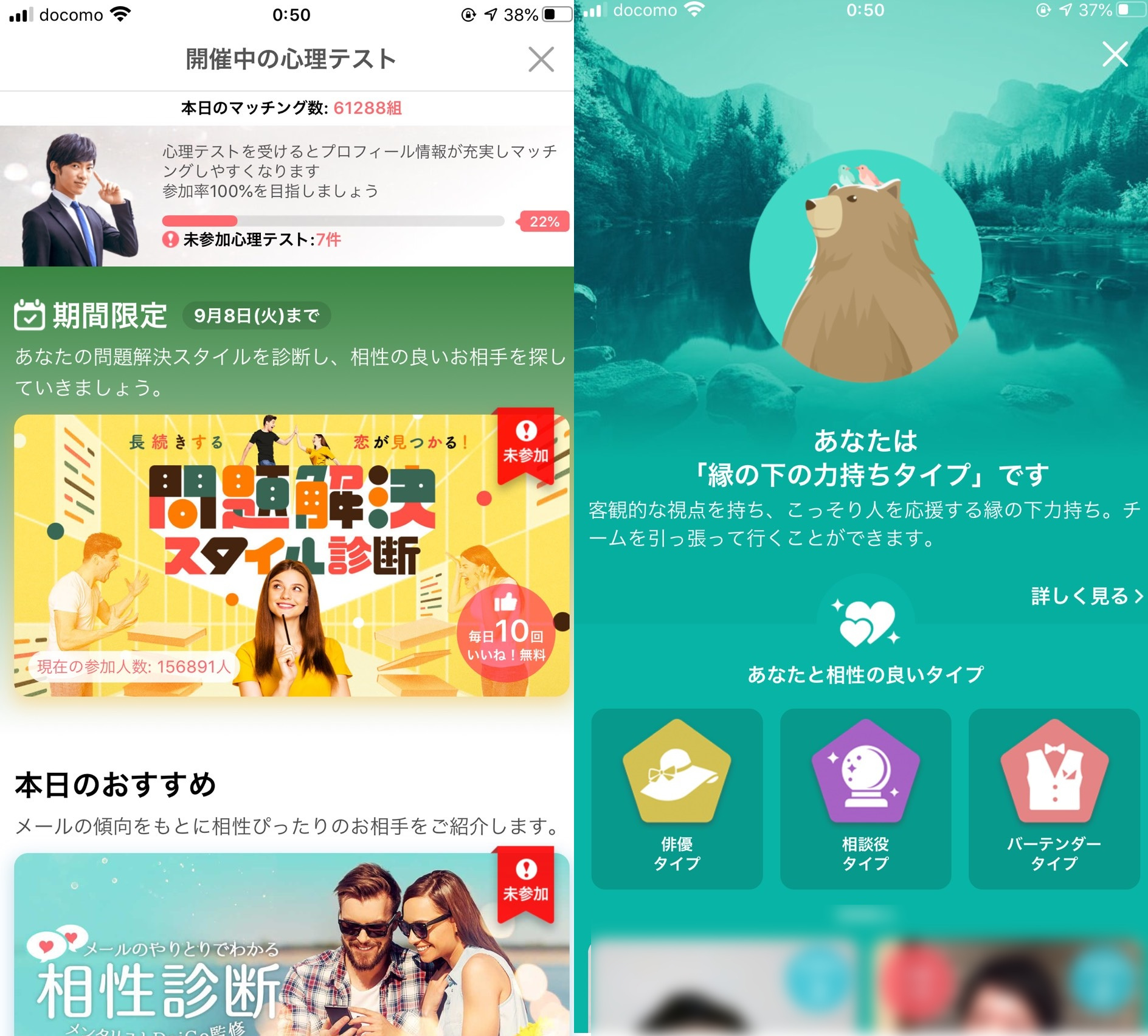 心理テストを用いたマッチングシステムは、斬新で素晴らしいと思いますが、毎回のように回答しなければならないのは少し煩わしかったです。