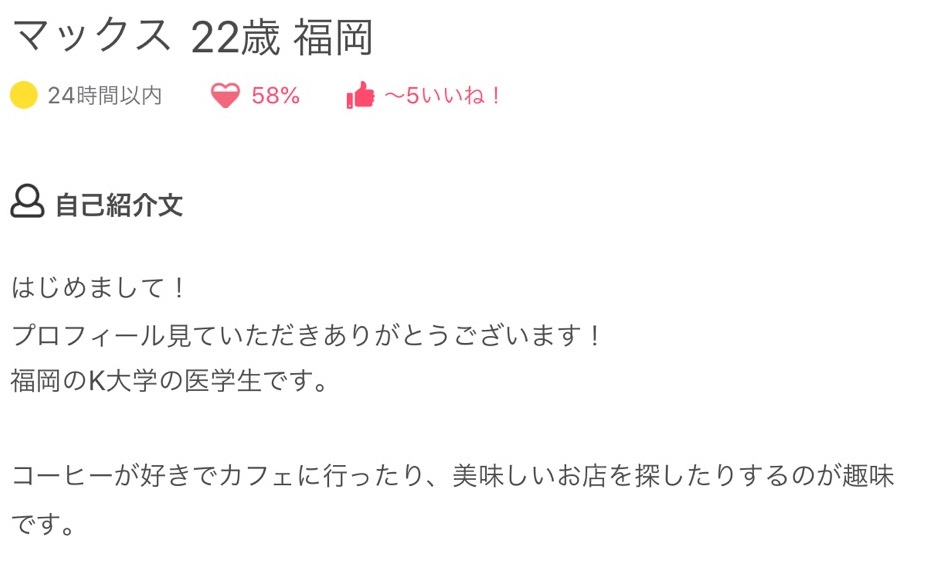 こちらの男性とやり取りをする場合、男性のプロフィールには「休日はカフェ巡りをする」という趣味が記載されています。