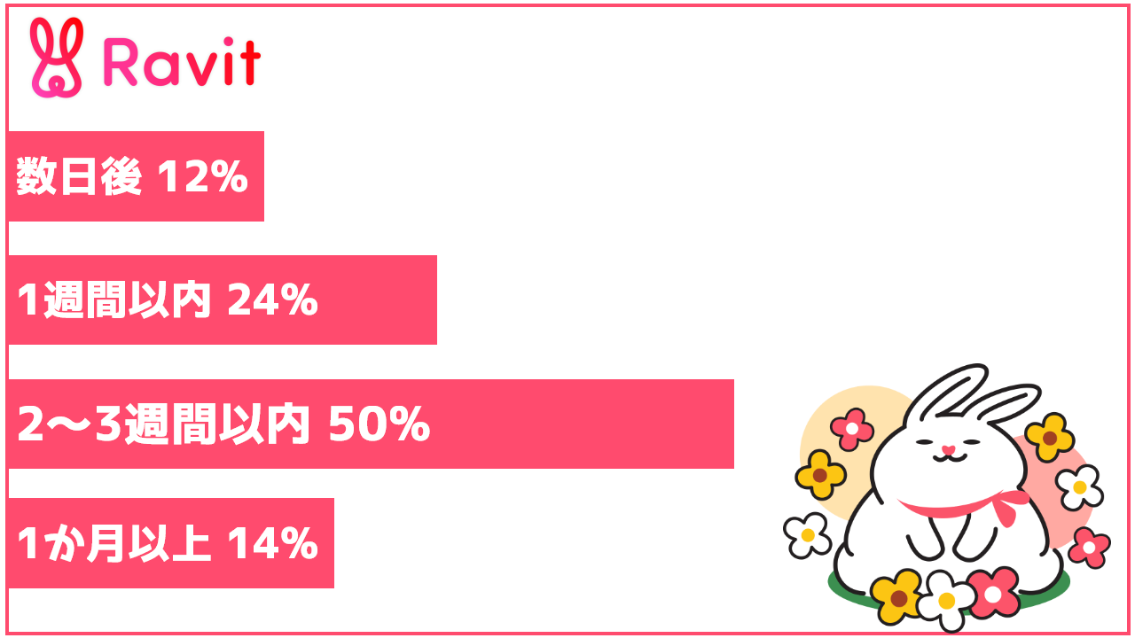そのため、Ravit(ラビット)は十分出会えるアプリと言えますが、”男性と会うまでにどのくらいの期間がかかるの?”と疑問に思う人も多いでしょう。