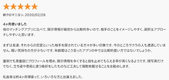 ”気軽な出会い目的が多い”という声もありますが、個人的には真剣な人が多い印象でした。